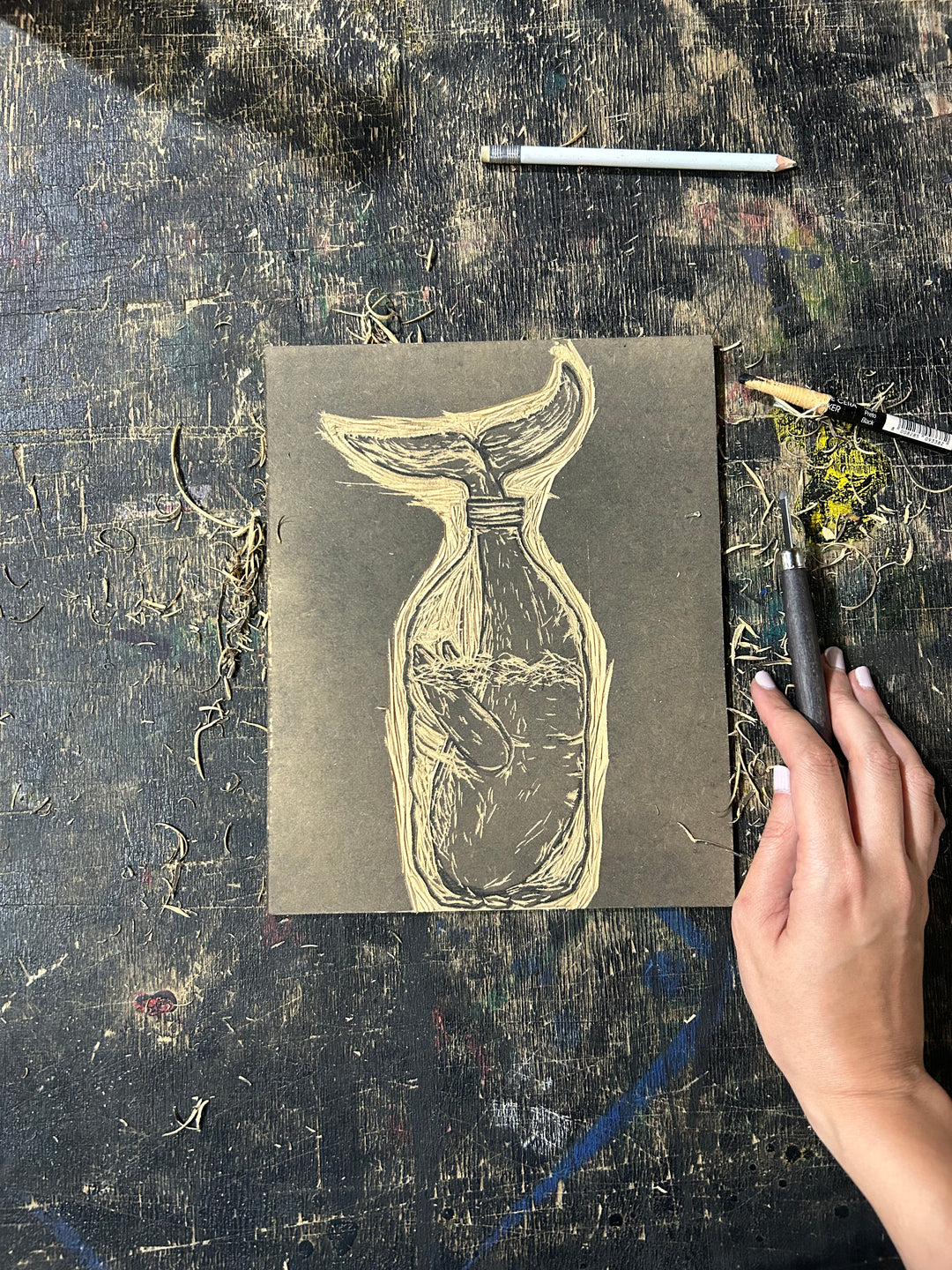 Every year, 8 to 10 million metric tons of plastic waste enter the ocean—that’s equivalent to dumping a truckload of plastic into the sea every minute. This Grabado piece addresses this critical issue, aiming to raise awareness and inspire action.